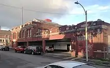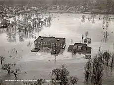 Yoerg's relatively brief tenure, left a considerable legacy in Holyoke, through the many WPA projects that he and his administration pursued, including the War Memorial Building, modernization projects of Mitchell Field and Mackenzie Stadium, modernizing of sewer systems, construction of the city's levy and pumping station systems, the implementation of modern school lunch programs, and the building of Lyman Terrace and Holyoke Housing Authority.[3][26] With Yoerg's extensive ties to the automobile industry, serving as a director of the Tri-County Automobile Club, he would however assure that the Holyoke Street Railway Company completely dismantled its tracks on city streets with the termination of trolley service in 1937.[27] Yoerg's Garage still stands today at Chestnut Street, as does Yoerg Circle in Beaudoin Village, the latter memorializing his pro bono service in helping to establish the housing authority.