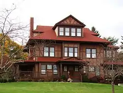 The William Park House is located in the mill village of Hanover, on a 3-acre (1.2 ha) parcel bounded by Main, Spruce, and Pearl Streets. It is a 2+1⁄2-story wood-frame structure, roughly rectangular in shape, with a wraparound porch and porte cochere. It is covered by a hip roof, obscured somewhat by large dormers that have broad bands of windows with either gabled or gable-on-hip rooflines. The walls are finished in stucco and half-timbering. Most windows are sash, with a multilight top sash and a single-pane lower sash, a distinctive Prairie School touch. The interior retains high quality woodwork and carved plasterwork, including staircase balustrades and builtin cabinetry.[2]