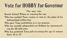 Hobby decided to enter politics and joined the Democratic Party. In 1914, he ran for and was elected Lieutenant Governor of Texas. After Governor James Edward Ferguson, known as "Pa" Ferguson, was impeached and forced to resign from office in a corruption case in 1917, Hobby succeeded him at 39 and was then the youngest governor in state history. Ferguson prohibited from serving in state electoral office again.
