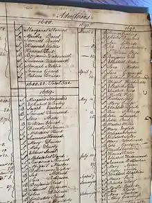 The two events are not mutually exclusive. Cotton Mather places the baptism the next day, March 23. The general court, where Cotton Mather played an active role, could have made Phips free with the understanding that Cotton Mather would add him to the rolls of the North Church. Records of the North Church show Phips' name added to admissions. (Curiously, a "B" for "brother" is withheld as prefix to his name, unlike all others. See image.) Another book, mostly recording infant baptisms, lists Phips as "Admitted and Baptized." Phip's wife's name doesn't seem to appear in the records at all. The admission and baptism of an adult was generally a somewhat drawn-out process over some weeks.[56] There doesn't seem to be any surviving record of Phips "coming to the table" to partake in the Lord's Supper, as only church members were invited to do.