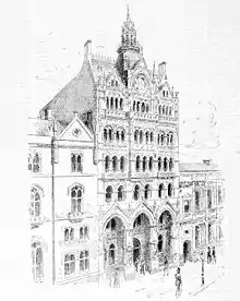 His first prize winning entry in 1883 for "Our Lodgings" (later Gordon House) in Little Bourke Street, was an exception to his generally elaborate designs, being instead in an austere Tudor mode suitable for housing for the poor.[5]