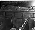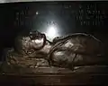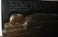 The W. T. Wyllie memorial in Portsmouth Cathedral is positioned on the East wall of the Quire and east of the Corporation Pew and remembers the second son of William Lionel and Marion Amy Wyllie. William Thomas Wyllie served with the 2nd Durham Light Infantry and was killed in action at Montauban on the Somme on 19 July 1916. He was acting as a Brigade Major at the time and is buried in Mametz Cemetery. He left a widow and three children. The memorial features a sculptured figure in silhouette/high relief which lies along the bottom half. This figure is the dead body of an officer lying on his back, arms by his side. His shirt sleeves are rolled up and he wears braces, trousers and boots. His head rests on a cushion surrounded by a laurel wreath. The inscription is incised in white lettering along the top half of the memorial. The bronze founders were Messrs A. B. Burton.[24][25]
