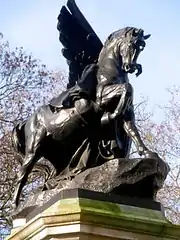 The Royal Artillery Boer War Memorial is on the corner of St James's Park in The Mall in central London. The memorial was designed by Sir Aston Webb and the bronze sculpture, including Pegasus and the two relief tablets, were executed by Colton. Completed in 1909 the composition was described by Colton as "War being controlled by peace, war being represented by a war horse & peace being a winged female figure." In the same letter Colton writes that the work "has become in a sense a part of the Queen Victoria Memorial Scheme."[21] The pillars list the 1,078 men who died in the South African war of 1899-1902 and relief panels show the unit in action. The memorial was unveiled in 1920 by the Duke of Connaught, using an electronic remote control from a memorial service in St Paul's Cathedral. The memorial was erected by the officers and men of the Royal Artillery in memory of their honoured dead.[22] The pedestal is in Portland stone and the sculpture, reliefs and panels with the names of those remembered, are all in bronze.[23]