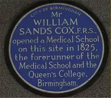 William Sands Cox (1802 in Birmingham – 23 December 1875 in Kenilworth[1]) was a surgeon in Birmingham, England. He founded Birmingham's first medical school in 1825[2] as a residential Anglican-based college in Temple Row, where a blue plaque commemorates him on the House of Fraser department store, and in Brittle Street (now obliterated by Snow Hill station). Cox went on to found the Queen's Hospital in Bath Row (Drury & Bateman, opened 1841) as a practical resource for his medical students.