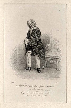 In Bath, he played such characters as Sir Anthony Absolute, Launcelot Gobbo, Foresight in 'Love for Love,' Sir Solomon Sadlips in The Double Gallant. In London, his great character was Justice Woodcock, in which he came only behind Munden and Dowton.[3] He 'created,' on 24 May 1799, the rôle of the boy in 'Pizarro.' Mrs. Chatterley, who was an agreeable actress in comedy, had the reputation of being the best representative of a Frenchwoman on the English stage.[1]