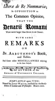 - The book referred to in the title is John Arbuthnot's Tables of Ancient Coins, Weights and Measures.