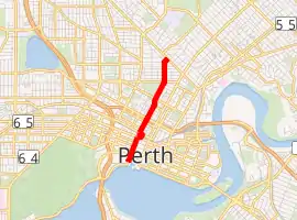 The Horseshoe Bridge takes the road over the Fremantle and Joondalup railway lines, passing between the Perth railway station and Wellington Street bus station. Beyond the bridge, the road continues in its south-south-westerly direction through the Perth CBD. It intersects all the major east-west routes. At the southern end of the bridge is Wellingtion Street. This is followed by Murray and Hay streets, which are pedestrian malls to the east; and then St Georges Terrace, which is a through-route for vehicular traffic. One more block takes it to an intersection with Mounts Bay Road, to the west, and the Esplanade to east. After one more block, alongside the Elizabeth Quay Bus Station and railway station, the road ends at Riverside Drive. This intersection also connects a Mitchell Freeway exit ramp and Kwinana Freeway southbound entrance ramp, components of the Narrows Interchange.[1]