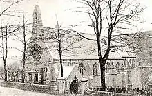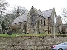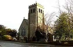 The foundation stone of this church was laid on 25 July 1868 by Rev. Charles Musgrave,[93] and it was consecrated on 25 February 1870.[94][95] It had two 1871 stained glass windows by Edward Burne-Jones and other windows by Dante Gabriel Rossetti and Ford Madox Brown. The remains of these windows are now at Cliffe Castle Museum.[96] When opened it had a west window with heads of four evangelists and four prophets, a bell turret, a sedilia, lectern, chancel tiles, pulpit and font.[94] The building was demolished in the 1970s.[96][97][nb 5]