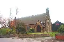 This is a Grade II listed building on Church Lane, Chapelthorpe, Wakefield, West Yorkshire WF4 3JG.[185][186][187] The church had been built in 1771, and Barber enlarged it by adding the chancel and sanctuary in 1882. He replaced the pews and pulpit, and removed the gallery, reading desk and clerk's desk. Barber's chancel took up 178 square yards of the churchyard, and increased the interior length of the building to 94 feet (29 m).[185] However the building burned down in 1951,[188] and was rebuilt with the original 17th and 19th century stone walls and openings. Therefore, Barber's exterior survives, rebuilt with the same materials and to the same plan.[185][189] It was Barber who noticed during the 1882 building work that one of the stones built into the east wall was of 13th-century origin, indicating the date of an earlier church on the site.[189][nb 27]