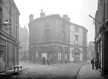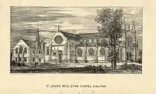St John's Methodist Church in Halifax, West Yorkshire, was sited at the corner of Harrison Road and Prescott Street. It was also known as St John's Wesleyan Church or Chapel, and was designed in Perpendicular Gothic style by Barber in 1880. It had a rose window and a Caen stone pulpit by Thompson of Peterborough.[168] On 23 February 1881 the rebuilt organ was opened by W.T. Best, who was the organist at St George's Hall, Liverpool. The organ had been rebuilt by Forster & Andrews, and Barber had designed "an elaborately carved case . . . to harmonise with the Perpendicular architecture of the chapel."[169] The building was declared redundant in 1965 and was demolished in September 1966, to be replaced by Trinity Court flats.[168][nb 22]