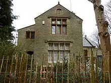 This is a Grade II listed building.[107] There is a picture of the building on its Images of England listing page.[108] It is situated near St Albans Presbytery off Dudwell Lane, Skircoat Green, Halifax, West Yorkshire HX3 0AT, and it was designed by Barber at a building cost of £2,300 in 1861, before Barber and Mallinson began their professional partnership.[109][110] It is a large, two-storey, gabled, detached house built in Gothic Revival style of coursed stone with ashlar dressings and bay windows. The left-hand chimney stack has a panel inscribed "1861." Inside, the stairway has "bulbous turned balusters and newels plus moulded hand rail."[108] It was later sold by the Church of England, and became Stafford Hall, then became a retirement home. As of 2010 it was under the control of Calderdale Council and had become dilapidated.[111][112] By 2014 the building had been renovated and had re-opened as a children's home.[113] There is no public access to the building.[nb 9]