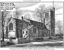 This is a Grade II listed building in Wakefield Road, Lightcliffe, West Yorkshire.[10] Barber designed this church as a replacement for Lightcliffe Old Church, of which the tower remains on another site.[130] The foundation stone was laid on Tuesday 16 September 1873, when the crane supports broke, causing injuries to several people.[131] It was consecrated by the Bishop of Ripon on 22 September 1875. It cost £15,000 to build, and has a 98 feet (30 m) tower including the 8 feet (2.4 m) turret. The nave is 71 feet (22 m) long by 22 feet (6.7 m) wide, with aisles of 10 feet (3.0 m) wide.[132][133] It has a Caen stone pulpit carved by John Birnie Philip, who also carved the reredos, and who created many works for George Gilbert Scott. James Clinsty of Huddersfield carved the font cover, and Charles Mawer of Leeds carved the capitals and other stonework. The church originally had an 1874 pipe organ by Booth & Kirkland, but this was replaced in 1905 with an organ by W. Andrews. Harry Percy Jackson carved the Watkinson Chapel and stalls.[132][134][135][136][nb 12]