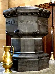 Barber reinstalled the original east window's stonework, and put in stained glass by Powell of Leeds.[156] A Caen stone credence table was built into the south wall of the chancel, there was new heating and gas lighting, and all windows had been replaced. Gill & Co. were the stonemasons. Items donated by the congregation were the altar cloth, altar rails and standards, alms dish and collecting bags, brass pulpit desk and lights, oak chairs, brass lectern and a new font carved by sculptor George Dyson of Crosland Moor.[14][157][nb 19]