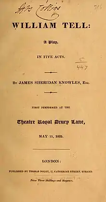William Tell is an 1825 historical play by the Irish writer James Sheridan Knowles. It portrays the legendary Swiss folk hero William Tell in his battle against the Habsburg authorities.[1]