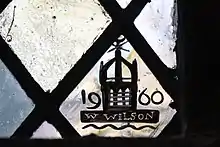 Wilson made the 'exceptional' windows at the Morningside North parish church, Edinburgh, now a community building.[3] An excellent detailed account of the windows he made for Greenbank Parish Church, Edinburgh is available.[11] In 1951 he completed the East window of St Andrew's church in Stamford Hill, as a replacement for the original which had been blown by a V1 during the blitz. [12] He made the East window for Ardwell church,[13] and in 1953, the East windows for St Machar's Cathedral, Aberdeen which depict the Nativity, the Last Supper, the Crucifixion and Christ surrounded by the Scottish saints,[14] and a window for Dunino church, Fife.[15] He made 16 windows between 1952 and 1961 for Brechin Cathedral, Angus, Scotland.[16] He is responsible for four windows in the chapel of the University of St Andrews, though given his increasing blindness the final two may have been partly the work of his assistants.[17]