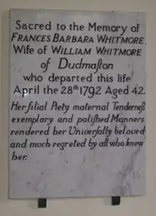 William Wolryche-Whitmore was originally plain William Whitmore. His father was also called William Whitmore, a former-sailor and businessman from Southampton, who inherited Dudmaston Hall, at Quatt in Shropshire, from a relative, who was distantly related to the widow of the penultimate Wolryche baronet. His mother was Frances Lyster, who played an important part in reshaping the grounds of Dudmaston.[4] She died in 1792, and the elder William Whitmore remarried Marie Louisa Thomas: from this later marriage are derived the Whitmore Jones family of Chastleton House.
