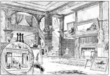 The gallery was located at the corner of Bedford and Washington Street until 1885.[9][10] The gallery moved in 1885 from downtown to Back Bay, where it remained until the business closed around 1907.[11][12][13] "Williams & Everett's Galleries, at No. 79 Boylston Street, were ... designed and built expressly as a repository of the Fine Arts. ... The architectural adornment of the interior is of the English Renaissance, with carved wood and heavy beams in sight. On one side is a carved chimney piece, extending to the ceiling, and near this is a grand staircase leading to a series of galleries, extending from the carved wood coigne which looks down into the store, to the balcony overlooking Park Square. The wainscoting of dark wood is surmounted with pomegranate hangings, and the ceiling is effectively decorated in plain and harmonious tints. Incandescent lights placed in the ceiling in a novel and original manner, are used throughout the store and galleries."[14]