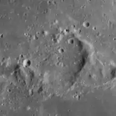 Little remains of the original crater, besides a low curving ridge. The rim has been nearly destroyed along the northwest face, leaving only a few ridges in the surface. The remainder forms an irregular horseshoe, with the western part attached to a series of ridges leading to the west. The interior floor has been resurfaced by basaltic lava, forming a flat, nearly featureless surface that is marked only by a pair of tiny craters near the northeast rim.