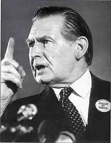 After serving as Shadow Secretary of State from 1962, he became Secretary of State for Scotland in 1964 under Harold Wilson. The Conservatives were in government from 1970-74, when Ross resumed his position until he lost office when Wilson resigned in 1976. During his tenure, he was responsible for the creation of the Highlands and Islands Development Board and the Scottish Development Agency, the forerunners of Highlands and Islands Enterprise and Scottish Enterprise respectively. Ross campaigned for a "No" vote in the 1975 referendum on British membership of the EEC.[1] He was also a firm unionist, in favour of Scotland and Northern Ireland remaining in the United Kingdom, and opposed devolution. Journalist Andrew Marr has called him "a stern-faced and authoritarian Presbyterian conservative who ran the country like a personal fiefdom for Harold Wilson". Ross coined the term "Tartan Tories" to describe the members of the Scottish National Party, whom he very much disliked; he was himself nicknamed "the hammer of the Nats" for his many attacks on them. The nickname "Tartan Tories" is still used in the present day by some left-leaning critics of the SNP.