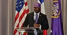 ![]() Simmons at press conference after being named head coach at Prairie View A&M | |