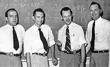 ![]() TI's silicon transistor team, from left to right, W. Adcock, M. Jones, E. Jackson, and J. Thornhill, 1954 | |