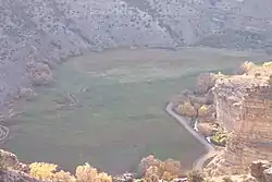 Willow Creek begins at the confluence of its East and West Forks about 25 miles (40 km) north of Thompson, Utah, in Grand County, to the north of the Roan Cliffs divide. East Willow Creek starts at an elevation of 8,504 feet (2,592 m) at a spring along the Roan Cliffs; the shorter West Willow Creek originates at an elevation of 8,359 feet (2,548 m).[4] East Willow Creek is joined by She Canyon before combining with West Willow Creek to form the main stem. From there, Willow Creek flows northward into Uintah County, through the Uintah and Ouray Indian Reservation, across the East Tavaputs Plateau at the bottom of a rugged gorge.[5] It receives several major tributaries from the east including Meadow Creek, Main Canyon and Sunday School Canyon. Below Sunday School Canyon, Willow Creek flows through a wider valley along the east side of Big Pack Mountain to its confluence with Hill Creek, its largest tributary. Above their confluence, Hill Creek is almost the same length as Willow Creek, flowing roughly parallel and several miles to the west of Willow Creek. Below this point Willow Creek turns northwest to join the Green River about 5 miles (8.0 km) south of Ouray and 3 miles (4.8 km) below the confluence of the White River.[5]