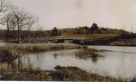 Bradley Palmer began purchasing what would eventually be 10,000 acres of land across the North Shore. In 1898, he purchased a 747-acre farm owned by the Lamson family, one of the oldest families in Ipswich, Massachusetts. The family's patriarch, William Lampson, came to the New World in 1634, and his descendants spread to many of the towns in the North Shore region. Palmer purchased the hereditary home of the Lamson family from William Lampson's descendant Arthur Lamson. On the property is an 18th-century farm house, also a DCR property.[1] The now heavily forested area would have originally been empty fields and pastures, ideal for Palmer's equestrian hobbies, especially with its close proximity to the famous Myopia Hunt Club. The mansion would have had a sweeping view of the surrounding landscape, including the Ipswich River.