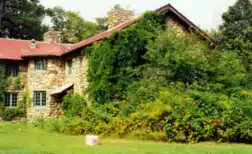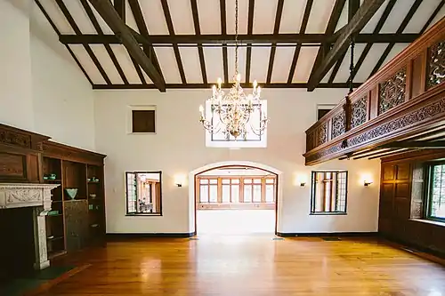 The north wing of the house was used for domestic functions, with a dining room, guest rooms, a study, and Palmer's master suite above the entrance so that he could look out at the Ipswich River. The southern wing held the carriage house and stable. The exterior of the mansion is made from fieldstone from the surrounding farms with a red-slate roof. For the interior, Cummings used primarily cherry and oak, finished with wax so that the interior maintained a natural look.[4] Construction of the mansion concluded in December 1902, having begun earlier that year.[5] The interior decoration would take a number of years to complete, however, though it was functionally done by 1904, as shown by the pictures Cummings provides in his article.[6]