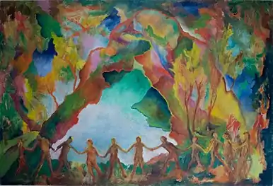 Deaths haunted Willy Fick during the inter-war period. His sister Angelika died 1923, his mother in 1927, his brother Richard in 1932, his father in 1935 and his sister Maria in 1939.[5] Deaths and the success of the Nazi party in 1933 dominated the negative iconography Fick developed. His dark works in which human simulacra float in a void and where life is played on or by a checkered board, were influenced by Surrealism, Neue Sachlichkeit and the Cologne Progressives. Although it was a personally sad and politically oppressive time, Fick's career prospered. He was a member of the Werkbund bildender Künstler/Association of Progressive Artists, exhibited at the Kölnisher Kunstverein/Cologne Art Institute, Becker and Newmann Gallery and with Johanna Ey, known as Mother Ey in Düsseldorf. Gottfried Brockmann who had been a friend of Fick's sister Angelika wrote, "Sometimes I saw pictures by him at Mrs. Ey's; they were small but very colourful. I still remember one of them clearly. It was a hot-house with steel blue and poisonous green flowers."[6] In 1927, Richard Riemerschmidt, director of the Kölner Werkschulen championed Fick so that he received a tuition-free scholarship thanks to Mayor of Cologne Konrad Adenauer. From 1928 until 1931 he studied full-time under the tutelage of Jan Thorn-Prikker, a famous glass painter and muralist. Thorn-Prikker's most significant impact on Fick's art was his lifelong interest in transparency and his love of colour experiments that looked like stained glass.