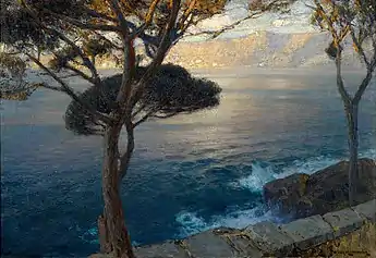 He travelled extensively; to Sweden, France, England and Italy. He initially favored Nordic coastal landscapes, but later came to prefer the brighter scenery of Italy. His major exhibitions included those at the Glaspalast (1888), the Große Berliner Kunstausstellung (from 1889), where he was awarded a small gold medal in 1896, and with the Berlin Secession (1898).