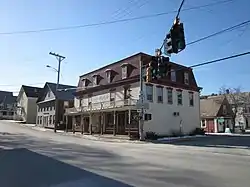 The town of Wilmington is located in rural southern Windham County, with its village center at the junction of Vermont Routes 9 and 100. Route 9 is the principal east-west route across southern Vermont, and Route 100 is the principal north-south route traversing the state on the eastern flank of the Green Mountains. The two roads meet at the North Branch Deerfield River, which historically provided the power for the village's industries. The historic district extends along Route 9 from Beaver Street in the east to the Valley Trail in the west, and along Route 100 from Beaver Street in the south to just beyond Lisle Hill Road in the north. The district has 59 historically significant buildings, and only five that are not. Most of these buildings were built in the 19th century, in vernacular versions of popular architectural styles. Particularly sophisticated buildings include the Crafts Inn and Memorial Hall, both turn of the 20th century buildings attributed to McKim, Mead & White.[2]