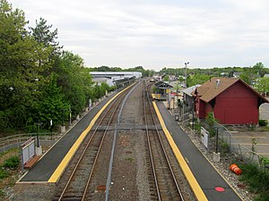 The station formerly had a single small side platform and no MBTA parking lot. In 1998, the MBTA began planning a $5.2 million renovation which included longer accessible platforms and a 227-space parking lot.[3] The project was completed in 2003 at a total cost of $13 million.[1][4]
