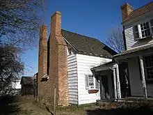 The residential structure or "the dwelling" of the house is immediately in front of the rear kitchen structure.[26][47] The residential structure is one and one-half stories in height and measures 24 feet (7.3 m) by 20 feet (6.1 m).[26][47] It is built of frame construction containing brick nogging (brick infill), and its exterior is sheathed in white-painted, beaded weatherboard siding.[26][47] A gable roof tops the structure.[47] Its exterior is symmetrically arranged, except for the prominent double brick chimneys on its western side, connected by a chimney pent[lower-alpha 2] on the ground floor.[26][47] Central entryways are positioned on both the rear (northern) and front (southern) façades, with six-over-six-light wooden sash windows positioned on either side of each respective doorway.[47] The upper level is illuminated by wooden sash windows in both its east and west gables.[47] The two windows on the western gable with the double chimneys are small four-light wooden sash windows, and the two windows on the eastern gable are six-over-six-light wooden sash windows.[47]