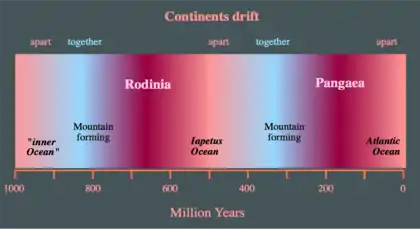 A Wilson cycle is not the same as a supercontinent cycle, which is the break-up of one supercontinent and the development of another and takes place on a global scale. The Wilson cycle rarely synchronizes with the timing of a supercontinent cycle.[5] However, both supercontinent cycles and Wilson cycles were involved in the formation of Pangaea and of Rodinia.