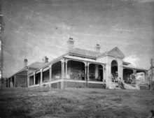 In July 1876, James Cowlishaw called tenders for a villa residence at Enoggera for William Wilson, which is understood to refer to Wilston House. Early photographs (circa late 1870s) show a core in face brickwork, with verandahs on three sides (to the west, south and east), a rendered masonry portico to the southern front entrance, a timber section along the north (rear) side of the house with a bay window at the eastern end, and an attached timber kitchen wing at the rear of the main building. The timber section of the house is understood to have contained one large room at the eastern end, divided by two sets of cedar doors from two smaller rooms, possibly guest bedrooms, at the western end. The cedar doors could be opened out to create a ballroom. Whether this wing was part of the original design, or a slightly later addition, is not clear. The portico to the front entrance may be a later addition, as the roof slates continue behind the portico roof structure. Slightly later photographs, thought to have been taken during the Wilsons' residence and therefore prior to 1885, reveal that the core had been rendered and bay windows to the two front rooms (at the southeast and southwest corners of the house) had been added. These matched in design the bay window of the earlier timber section on the north side of the house. By this period, three terraces on the southern (front) side of the house had been established, with concreted steps leading to each. It is understood that the lower terrace contained a croquet or tennis lawn, on which a portable dance floor and marquee could be erected when the Wilsons entertained.[1] The last event Willam Wilson held was the wedding of his stepdaughter, Margaret Coutts, on the 20th of December 1884 before heading on a trip to America and to his old home in Ireland.