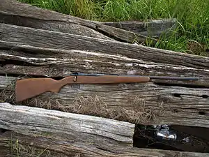 The Winchester Model 121 is a single-shot bolt-action .22 caliber rimfire rifle that was produced from 1967 to 1973 by the Winchester Repeating Arms Company. The 121 can fire .22 Short, .22 Long, or .22 Long Rifle cartridges from its 20¾" barrel. The barrel rifling is 1 turn in 16 inches with a right-hand twist. The bolt is a controlled-round feed design (like that of the Winchester Model 70) and utilizes dual locking lugs on the front.[1] The rifle also has an automatic safety that is engaged each time the bolt is cycled, so any time a round is loaded the safety is on and has to be manually turned off before the rifle is ready to fire. The Model 121 came with iron sights, with the rear sight being adjustable for elevation and windage. The receiver is also grooved to accept a scope if one is so desired. The Model 121's stock is a one-piece modified Monte Carlo, made of American hardwood with a Walnut finish.