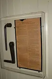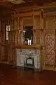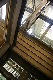 Before the 1906 earthquake, the house had been seven stories high and carpenters may have been brought in initially to repair damage caused by the quake.[10] Today it is only four stories. The house is predominantly made of redwood, as Mrs. Winchester preferred the wood; however, she disliked the look of it. She, therefore, demanded that a faux grain and stain be applied. This is why almost all the wood in the home is covered. Approximately 20,500 U.S. gallons (78,000 L) of paint were required to paint the house. The home itself is built using a floating foundation that is believed to have saved it from total collapse in the 1906 earthquake and the 1989 Loma Prieta earthquake. This type of construction allows the home to shift freely, as it is not completely attached to its brick base. There are roughly 161 rooms, including 40 bedrooms, two ballrooms (one completed and one unfinished) as well as 47 fireplaces, over 10,000 panes of glass, 17 chimneys (with evidence of two others), two basement levels and three elevators. Winchester's property was about 162 acres (66 ha) at one time, but the estate has since been reduced to 4.5 acres (1.8 ha) – the minimum necessary to contain the house and nearby outbuildings. It has gold and silver chandeliers, hand-inlaid parquet floors and trim, and a vast array of colors and materials. Due to Mrs. Winchester's debilitating arthritis, special "easy riser" stairways were installed as a replacement for her original steep construction. This allowed her to move about her home freely as she was only able to raise each foot a few inches. There was only one working toilet for Winchester; it has been said that "all other restrooms were decoys to confuse spirits" and that this is also "the reason why she slept in a different room each night".[12] The home's conveniences were rare at the time of its construction. These included steam and forced-air heating, modern indoor toilets and plumbing, push-button gas lights, and Mrs. Winchester's personal (and only) hot shower from indoor plumbing. There are also three elevators, including an Otis electric and one of which was powered by a rare horizontal hydraulic elevator piston. Most elevator pistons are vertical to save space, but Winchester preferred the improved functionality of the horizontal configuration.