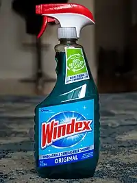 On August 26, 1969, Melvin E. Stonebraker and Samuel P. Wise received U.S. patent #3,463,735[5] for a glass cleaning composition, listing example formulae, one of which is 4.0% isopropyl alcohol, 1% ethylene glycol monobutyl ether, 0.1% sodium lauryl sulfate (a surfactant), calcium (Ca) 0.01%, tetrasodium pyrophosphate (a water softener), 0.05% of 28% ammonia, 1% of a dye solution, and 0.01% perfume. This formula was not only inexpensive to manufacture but allowed the product to be packaged in glass bottles and dispensed with a plastic sprayer. In 1989, Windex was a 5% ammonia solution.[6] The product was reformulated in 2006.[7] In 2009, S.C. Johnson started publishing ingredients for all of its products, including Windex.[8] The S.C. Johnson website lists Windex's ingredients as water, 2-hexoxyethanol, isopropanolamine, sodium dodecylbenzene sulfonate, lauramine oxide, ammonium hydroxide, fragrance, and Liquitint sky blue dye.[9] An alternative variant also for household use cites water, hexoxyethanol, isopropanolamine, ammonium hydroxide, sodium C10-C16 alkylbenzenesulfonate, lauramine oxide, sodium xylene sulfonate, colorants, and fragrances.