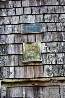 The mill was built by James Mitchel in 1800 at North Haven, on a peninsula just north of Sag Harbor called Hog Neck in the nineteenth century. Relocated here in 1813, it replaced a previous mill at the site which was destroyed by a blizzard in 1811.[3] It was added to the National Register of Historic Places in 1978.[1] The windmill measures 29 feet 4-1/2 inches from the first floor to the apex of the cap, making it the shortest surviving windmill on Long Island. At 23 feet 3/4 inches, the sails of this mill are the smallest of any found on a Long Island windmill. The Southampton Colony Chapter of the Daughters of the Revolution placed a plaque above the door in 1934 when it was designated a part of a public park.[4] The HISTORIC AMERICAN ENGINEERING RECORD in the engineering report described it as.. "The Corwith windmill is the smallest, and second oldest, of 11 surviving windmills on the South Fork of Long Island, which has the largest regional group of windmills in America. Of the local mills, it is the only example of the early type of smock mill, which had a stationary tower with a revolving cap that sat directly on a greased curb at the top of the tower. Later smock windmills, such as the Hayground Windmill, had rollers on the curbs to facilitate rotating the cap and its wind sails."[5]