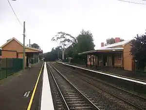 The station complex includes two timber station buildings: a third-class building of type 4 design (1871) and a timber island/side building (1915) with shelter shed and a brick-faced platform (1915). A reverse skillion-roofed timber signal box (1915) and skillion roofed out of shed also form part of the precinct. The station plantings, lights and furniture are also included in the heritage listing.[2]