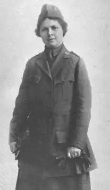Warder was 31 years old when she began training at the First National Service Training Camp for Women in 1916.[5] The following year she began preparing for overseas duty, to work in war camps and hospitals. In 1918 she joined the effort of the Women's Overseas Hospitals, as part of the Gas Motor Unit No. 1, to provide first aid in the trenches after a gas attack. However, on her way to France, she became ill, and died soon after arriving at Bordeaux, France, in a military hospital, aged 33 years, a casualty of the 1918 flu pandemic.[6] Her death was included in official casualty counts reported by the army, with her position give as "cook".[7] Gertrude Foster Brown, the Director General of Women's Overseas Hospitals, wrote a letter to Warder's parents, describing her last days, and her funeral service in Bordeaux. "Your daughter has given herself to her country just as much as if she had gone to the firing line, and I hope you will find some consolation in that thought. We have mourned her as if she were our own."[2] Warder's remains were returned to Illinois for burial with full military honors.[8]