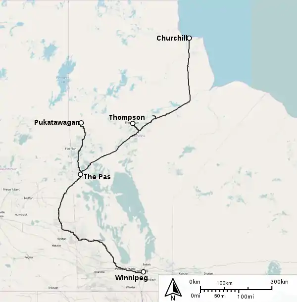 ![]() The Winnipeg–Churchill train at Churchill in 1997 | ||||||||||||||||||||||||||||||||||||||||||||||||||||||||||||||||||||||||||||||||||||||||||||||||||||||||||||||||||||||||||||||||||||||||||||||||||||||||||||||||||||||||||||||||||||||||||||||||||||||||||||||||||||||||||||||||||||||||||||||||||||||||||||||||||||||||||||||||||||||||||||||||||||||||||||||||||||||||||||||||||||||||||||||||||||||||||||||||||||||||||||||||||||||||||||||||||||||||||||||||||||||||||||||||||||||||||||||||