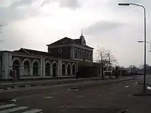 The 19th-century station building is owned by NS Stations.[24] It is of the type SS 3rd class, which was designed by Karel Hendrik van Brederode.[1] SS 3rd class was chosen instead of the smaller SS 4th class because of the importance of Winschoten as a commercial center.[13] Eight buildings of SS 3rd class were completed in the Netherlands between 1862 and 1865, of which four remain today.[25] This building of 1865 has a median risalit and wings on both sides parallel to the railway. The facade on the city side and railway side are identical, except for a half round decoration on the city side. The doors and windows of the building have arched frames.[26] In the 1904 expansion, an enclosed porch was added and the east wing was extended with an extra waiting room.[1][13]