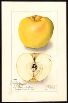 'Winter Banana' is an apple cultivar with high-quality fruit used for fresh eating.[1][2] The fruit is large, with smooth yellow skin that shows bruises more than red apples do. The flesh is rather coarse textured, moderately soft, sweet and aromatic.[1][2] Sugar 12.5%, acid 7g/litre, vitamin C 12mg/100g.[3]