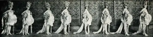 While on a trip to Europe, Lee had met with German producer Max Reinhardt, who had pioneered the idea of a runway extending from a stage into the audience. Lee copied Reinhardt's idea, adding a bridge above the orchestra seats.[19] In early 1912, Jolson, Deslys, and Stella Mayhew starred in The Whirl of Society,[77][78][79] the first show to use the Winter Garden's runway.[79] Jolson performed near the audience on the runway, as did 80 lightly clothed showgirls,[80][81] leading the runway to be nicknamed the "bridge of thighs".[19][82] (From) Broadway to Paris premiered in November 1912,[83][84][85] and Jolson, Deslys, and Fanny Brice appeared in The Honeymoon Express the next year.[86][87][88] Jacob's son, John Shubert, subsequently recalled that after The Honeymoon Express, Jolson returned to the Winter Garden once every 18 months on average. Jolson's shows typically premiered early in the year, then went on tour after a summer break.[89] These shows included Dancing Around (1914),[90][91] Robinson Crusoe, Jr. (1916),[92][93] Sinbad (1918),[87][89][94] and Monte Cristo Jr. (1919).[87][95][96]