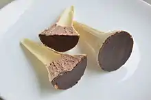 Winter ice cream (Hungarian: téli fagylalt [ˈteːli ˈfɒɟlɒlt] or téli fagyi [ˈteːli ˈfɒɟi]) is a Hungarian confectionery similar in appearance to ice cream in a cone, but traditionally having ganache or a similar kind of sweet cream filling with usually a chocolate-cocoa flavoring.[1][2] It gained popularity in the 1970s in communist Hungary,[3] being produced as a winter alternative to "summer" ice creams, which were deemed to be too cold for winter sweets.[2] Apart from grocery shops, it was frequently sold as part of the national railway's catering service (utasellátó).[3] The confectionery's popularity faded in the early 1990s, when, after the end of communism, foreign candy manufacturers and their products appeared on the Hungarian market.[3] However, along with some other snack foods and soft drinks of communist-era Hungary, winter ice cream garnered renewed interest in the late 2000s and 2010s.[4][3][5]