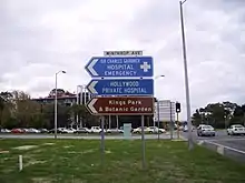 Winthrop Avenue's southern terminus is at the intersection of Stirling Highway and Mounts Bay Road. Directly south of the intersection is the Crawley campus of the University of Western Australia, with residential colleges Curie Hall and Saint Catherine's College located north-east and north-west respectively. Past the colleges, 200 metres (660 ft) north of the intersection, the road becomes the boundary between Kings Park to the east, and the suburb of Nedlands to the west. From this point north, Winthrop Avenue is also part of Tourist Drive 200, a circular route around Kings Park.[2] Residential properties line the northbound carriageway for 350 metres (1,150 ft), until the Monash Avenue traffic light controlled intersection. North of this intersection is the Queen Elizabeth II Medical Centre, where Sir Charles Gairdner Hospital is located. Winthrop Avenue travels alongside the medical centre site for 700 metres (2,300 ft) until its northern terminus at Aberdare Road, at the southern edge of Shenton Park. The road, and State Route 61, continue north-east as Thomas Street, towards West Perth and Subiaco.