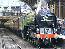 For the British leg, behind Tornado and her maroon support coach, the train was headed by Pegasus, a cream and brown Pullman Bar Car incorporating the Trianon Bar, followed by the historic 1950s built red and cream The Royal Scot rake of British Railways Mark 1 passenger coaches of Riviera Trains.[16] Pegasus was built in 1951 for the famous Golden Arrow boat train, and later rebuilt for heritage mainline use.[18]