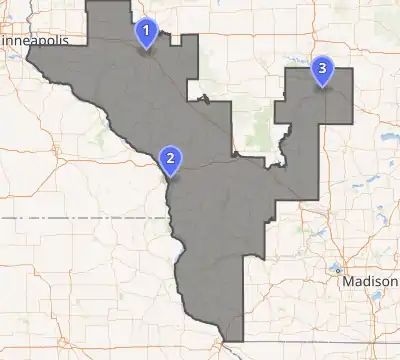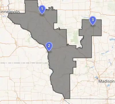 Interactive map of district boundaries. Points indicate the cities of Eau Claire, La Crosse and Stevens Point, ordered by population. | |||