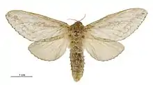 The wingspan is 44–64 mm for males and 58–75 mm for females. The forewings have white scales. The hindwings are yellow fawn or pinkish fawn with a narrow, distinct dark marginal line. Adults are on wing from October to May.[2]
